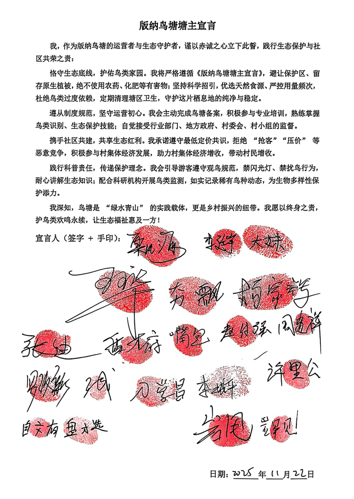 《版纳鸟塘塘主宣言》主要包括恪守生态底线、护佑鸟类家园;避保护区、留原生植被、禁用农药化肥,科学招引鸟类;遵守运营规范,接受多方监督;拒恶意竞争、助力村集体增收;引导游客文明观鸟、配合科研监测,传递保护理念等内容。