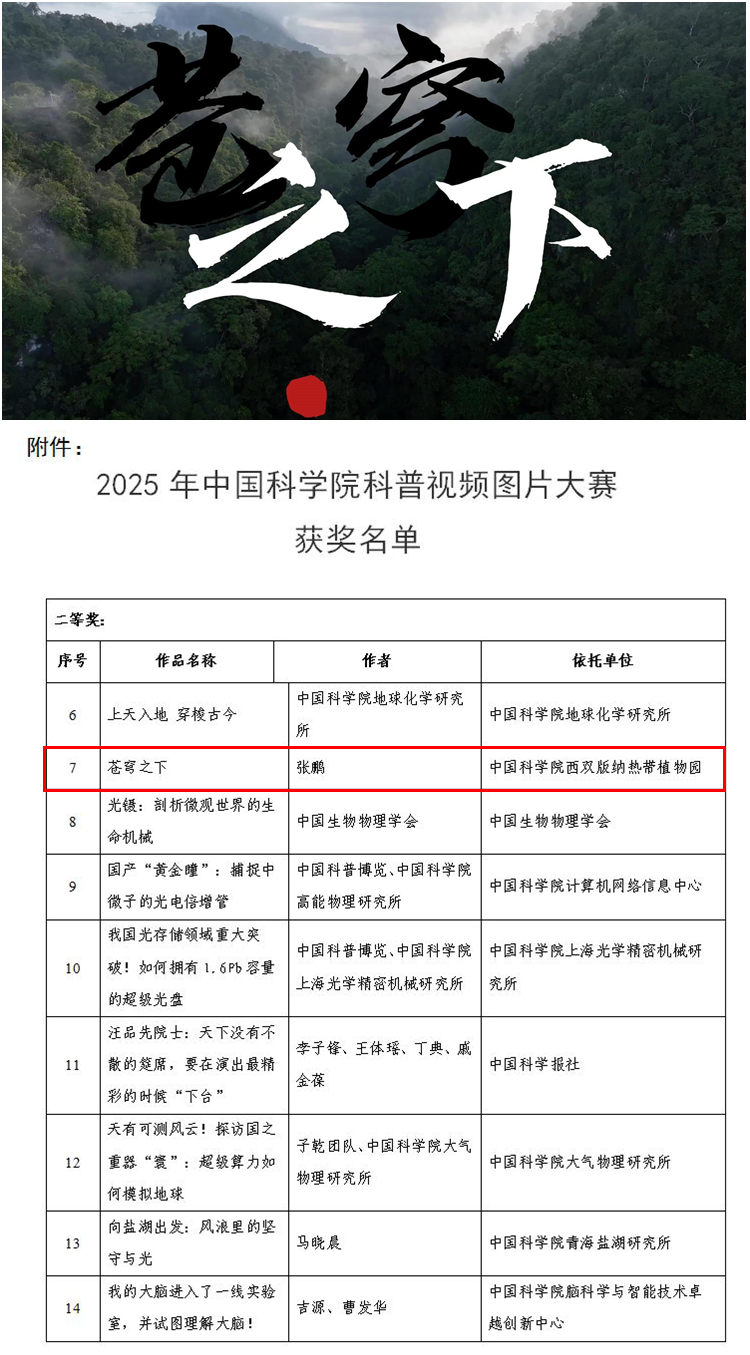 近日,2025年中国科学院科普视频图片大赛获奖名单正式公布。在本届大赛中,中国科学院西双版纳热带植物园(以下简称“版纳植物园”)共选送5部作品,其中4部脱颖而出,荣获佳绩。具体包括公开组科普视频类二等奖1项、公开组科学图片类二等奖1项、三等奖1项及优秀奖1项。