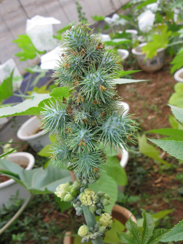 蓖麻的花序:上部球状的是发育中的果实,下部黄色的为开放和未开放的雄花