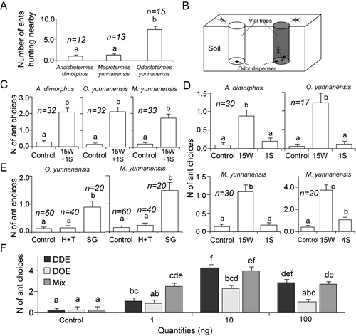 为了研究版纳地区横纹齿猛蚁Odontoponera transversa对同区域的几种培菌白蚁(云南土白蚁Odontotermes yunnanensis, 云南大白蚁Macrotermes yunnanensis, 小头钩白蚁Ancistrotermes dimorphus)捕食过程中的化学通讯机制,版纳植物园化学生态研究组与昆明动物研究所联合培养的博士研究生文晓岚在文平助理研究员的指导下开展了相关研究,结果发现:猛蚁对白蚁窃听的信号主要来源于白蚁的腹板腺的踪迹信息素,能被白蚁踪迹信息素提取物引诱。进一步的化学和行为分析表明:云南土白蚁会根据采食状态调节踪迹信息素的两个成分十二碳一烯醇(DOE)和十二碳二烯醇(DDE);DDE对白蚁同群个体比DOE具有更强的召募活性,其气味对蚂蚁来说指示着更丰富的猎物,也具有更高的被防御风险。蚂蚁能够从嗅觉上有效地高灵敏度地区分这两个成分以表现出不同的捕食行为反应模式。尽管修筑泥被作为防御工事以躲避蚂蚁捕食,土白蚁的踪迹信息素气味还是能通过新修泥被上的小孔漂到空气中被蚂蚁利用,捕食中的横纹齿猛蚁甚至能够破坏泥被快速准确的捕食泥被下的工蚁。这使得能高效进行踪迹化学信息交流的土白蚁成为了猛蚁的主要捕食对象。