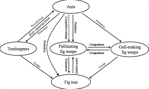 蚂蚁-角蝉和榕树-榕小蜂互利共生网络种间关系。