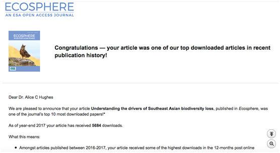 2017年1月,版纳植物园景观生态学研究组组长、副研究员Alice Hughes发表在国际杂志Ecosphere上的综述文章《认识东南亚生物多样性丧失的驱动因素》(Understanding the drivers of Southeast Asian biodiversity loss)中,讨论了东南亚区域生物多样性面临的最严重威胁,引起国际社会广泛关注。截至2017年底,该文章已被下载5684次,是该杂志2016-2017年间发表的文章中下载量最高的文章之一。