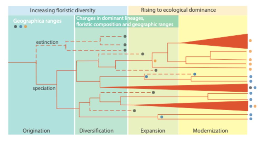被子植物(又称有花植物)是现存植物类群中多样性最丰富的类群,其物种多样性占现存植物的90%以上(约35万种),也是除寒带及山地针叶林外,在全球主要植被类型中均占据显著生态优势的核心类群。自白垩纪早期崛起以来,被子植物经历了多次辐射事件,逐步取代蕨类、裸子植物等古老类群,形成现代植被的基本架构,驱动陆地生态系统向现代模式转型,进而重塑地球生态系统格局。随着古植物学证据的积累,分子系统学的快速发展,以及新方法在整合分子和化石证据方面的卓越贡献,我们对被子植物起源与演化的认识也不断加深。但被子植物何时以及如何实现多样化、获得生态优势并塑造陆地生态系统,仍缺乏系统性的理论整合。