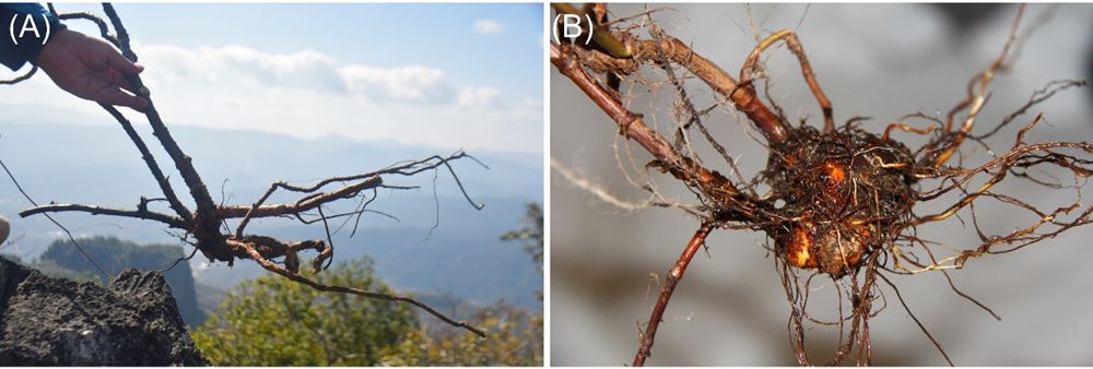 图 4. 石灰山野荞麦和金荞麦的形态特征区别 (A)石灰山野荞麦宿存的木质化根和茎基的形态特征。(B)金荞麦的地下球茎形态特征。