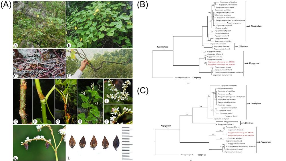 图 5. 石灰山野荞麦 (A)形态特征 A生境;B植株整体;C地上茎;D地下根;E具皮孔的成熟茎;F托叶鞘及部分茎与叶柄;G幼茎;H复合总状花序;I总状花序;J花;K具花果的花序;L瘦果。(B)基于叶绿体DNA片段(accD、matK、rbcL、psbA-trnH和trnL-F)联合数据集构建的系统发育树。(C)基于nrITS数据集构建的系统发育树。