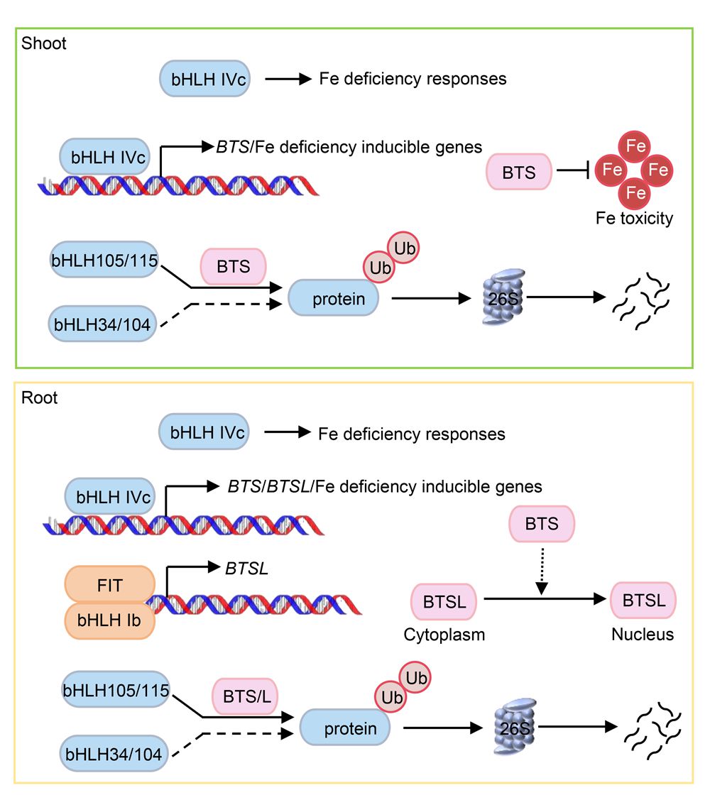 铁(Fe)是植物生长发育必须的微量营养元素。遭受缺铁胁迫时,植物通过激活铁吸收基因的表达以获取铁;在铁供应过量时,植物会及时抑制铁吸收系统以减少铁吸收。植物精细调控体内铁平衡的过程称为铁稳态。BRUTUS(BTS)及其同源蛋白BTS LIKE1(BTSL1)和BTSL2是拟南芥的铁感应器,而bHLH IVc亚族转录因子(包括bHLH34、bHLH104、bHLH105和bHLH115)是拟南芥缺稳态信号的正调控因子。然而,关于BTS/BTSL1/2和bHLH IVc协调整个植物铁稳态的机制尚不清楚。对于大多数植物而言,地上部是植株生物量的主要构成部分,且相比地下根系,其对铁元素的需求量更高。与研究较为深入的根系缺铁响应机制不同,地上部的缺铁响应机制尚未引起足够关注。因此,植物在全局水平上调控铁稳态的机制还存在较大空白。