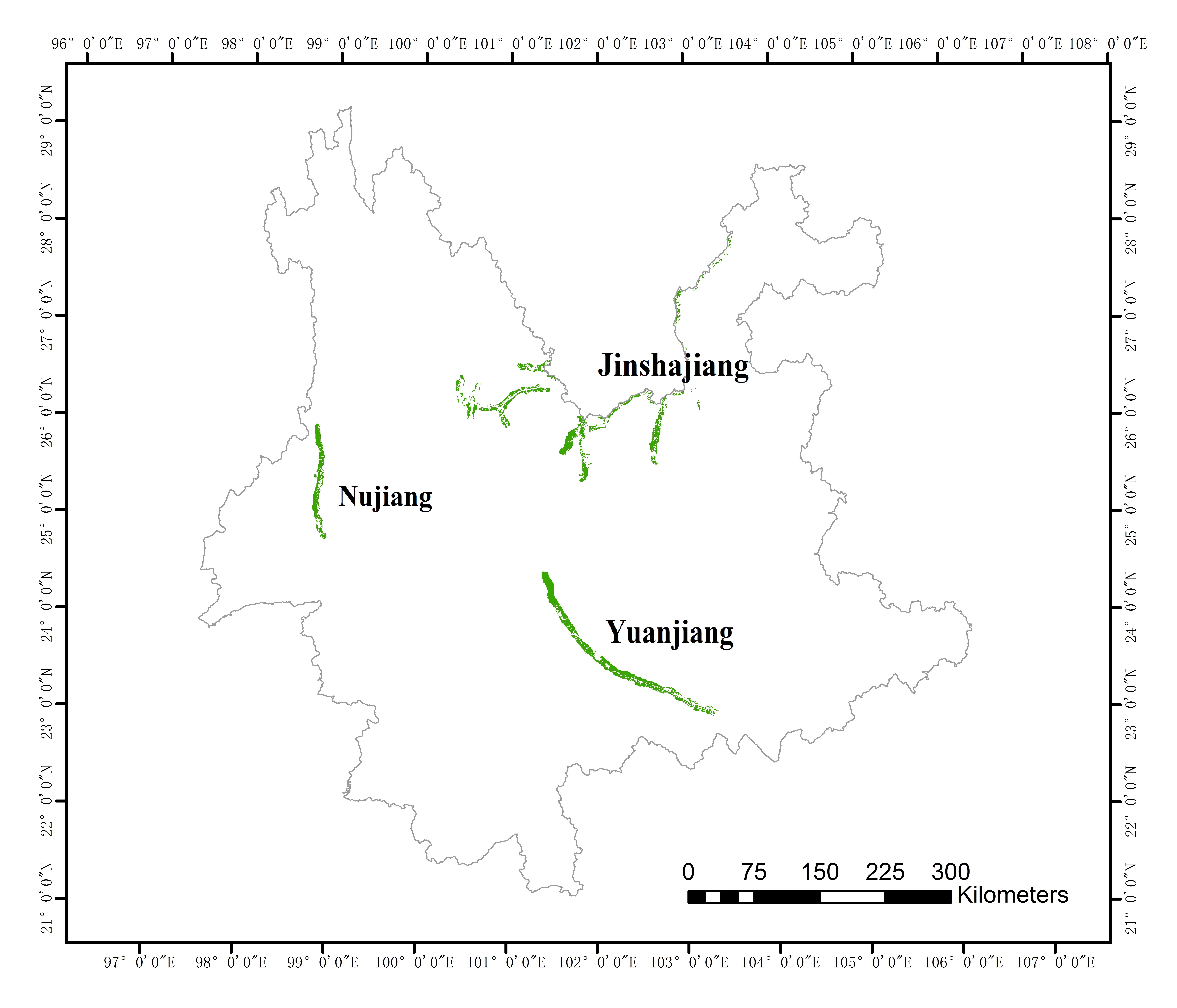 元江、怒江和金沙江的河谷型萨王纳植被分布图(基于2016年资料和作者核实,中科院西双版纳热带植物园景观生态实验室杨建波制)