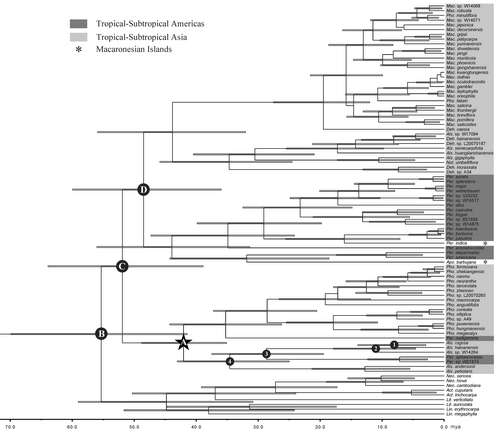 中科院西双版纳热带植物园植物系统发育与保护生物学课题组博士研究生李朗在导师李捷研究员和德国汉堡大学Jens G. Rohwer教授的共同指导下,针对樟科鳄梨属群植物所存在的系统学争议和生物地理学问题,开展了全面而深入的系统发育重建和生物地理学研究工作。在研究中通过选取鳄梨属群78个物种及相关类群9个物种,使用ITS和核单拷贝功能基因LEAFY作为分子标记,重建了鳄梨属群的系统发育。同时,利用分子钟分析,对鳄梨属群的起源和属群内几次重要的分化时间进行了推测,在结合形态学,古植物学,古地质学和古气候学等多学科证据进行综合分析后,得出如下结论:(1)确定鳄梨属群为一个单系类群,属群内润楠属和楠属各为一单系类群,油丹属、莲桂属和鳄梨属为复系类群,Apollonias属与鳄梨属、赛楠属与油丹属关系密切;(2)进一步证实了花被片特征是解决鳄梨属群系统学问题最重要的形态学性状,对于属群内各类群间的界定具有重要的分类学意义;(3)根据分子钟推测结果,鳄梨属群起源于始新世早期(~55.3 mya)鳄梨族—月桂族植物在劳亚古陆上的扩散过程中;(4)鳄梨属群在始新世中期经历了两次重要的分化(~51.9 mya,~48.5 mya),其现今热带、亚热带亚洲—美洲间断分布格局是由于始新世中后期全球气候变冷导致北热带植物群(Boreotropics)向低纬度地区退缩形成的隔离所致;(5)研究还发现了鳄梨属群中出现的亚洲和美洲,美洲和大西洋Macaronesia群岛之间的少数长距离扩散事件。