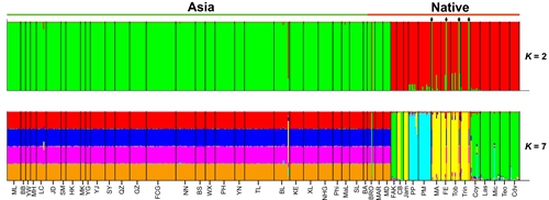 基于6个SSR位点的贝叶斯聚类分析结果,箭头表示在特立尼达和多巴哥岛屿及佛罗里达发现的入侵地亚洲地区飞机草的基因型,K值表示居群的分组情况。