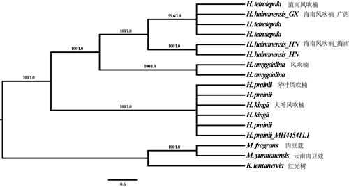 利用叶绿体基因组构建的中国风吹楠属系统发育树