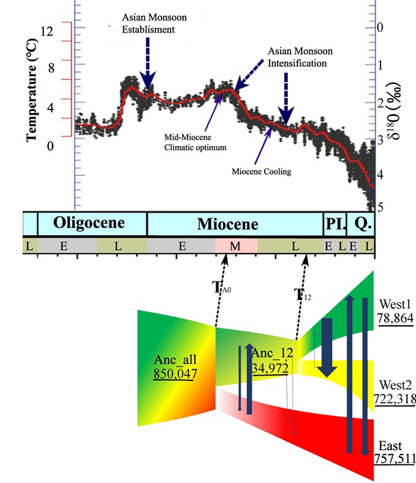 版纳植物园植物系统发育与保护生物学课题组博士研究生肖建华在李捷研究员指导下,利用简化基因组测序(RAD-seq)对12个居群(72个个体)进行群体遗传分析、群体动态历史构建以及物种分布模拟,探讨了桢楠的遗传格局、遗传格局的成因及其可采取的保护措施。群体遗传研究结果表明:桢楠群体的遗传多样性较低而遗传分化明显;桢楠可明显分为两个组以及两个亚组,即东、西一与西二亚组;群体动态历史的结果表明其东西两组的分化时间可追溯至中中新世(~15.08Ma),西一与西二组的分化时间可追溯至晚中新世(~7.12Ma),而这两个时间大致于东亚季风的第一与第二次加强事件的时间吻合。此外,结合地理隔离模型与物种分布模拟,作者发现桢楠主要沿着四川盆地的四周分布,且遗传距离和环形地理距离正相关。基于群体遗传的研究结果,作者提出桢楠的保护策略首要采取就地保护措施,需对位于风水林的群体(青城山和邛崃)与林场的群体(铜梁、永川群体)采取减少人为干扰的就地保护;结合物种分化历程的推演,作者认为当需要采取迁地保护措施时应尽可能的提高群体(组)内的遗传多样性而避免东西两个群体(组)间的融合。