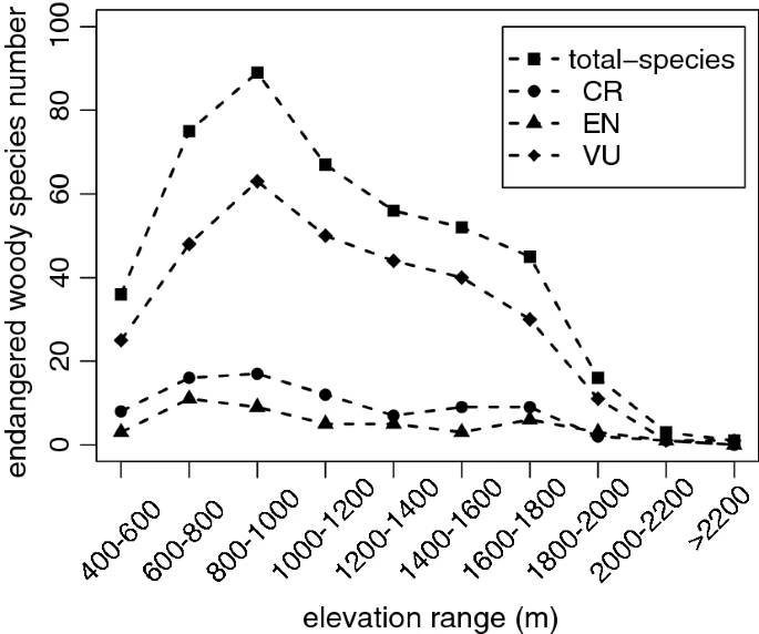 西双版纳地区受威胁木本树种的海拔分布情况