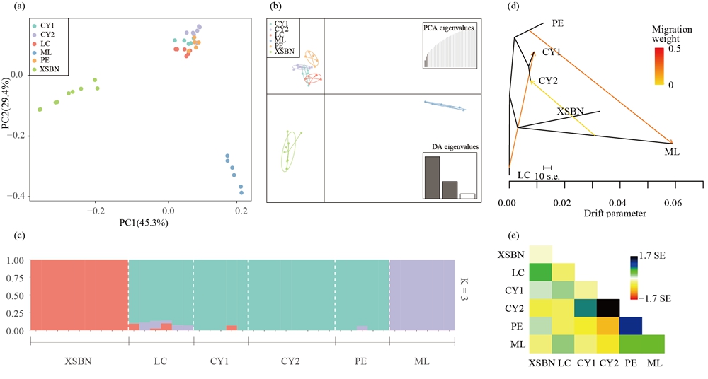 三棱栎居群的遗传结构 (a, b ,c) 与基因流检测结果 (d, e)