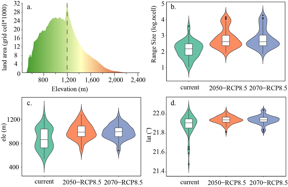 西双版纳地区可利用土地面积随海拔变化趋势(a)与气候变化下濒危物种的分布变化趋势(b, c, d)