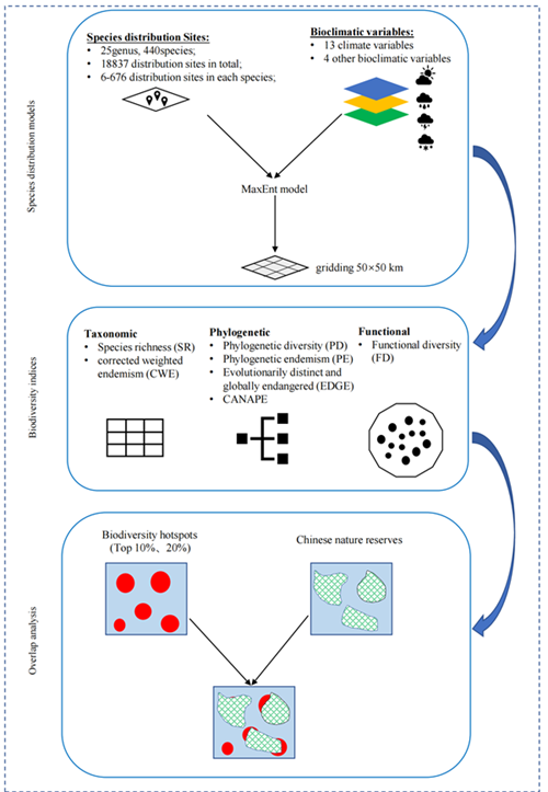 中国科学院西双版纳热带植物园(以下简称“版纳植物园”)植物系统发育与多样性保护研究团队以最大熵(MaxEnt)模型模拟当前樟科物种的潜在分布为数据基础,利用DNA条形码ITS构建286种中国樟科植物的系统发育关系,并收集了叶面积、株高等物种功能性状,从物种、进化和功能三个方面分析樟科多维度的多样性空间分布格局。研究发现,中国樟科各多样性指标呈现出不完全一致的空间分布格局,形态特征的平行进化可能是造成功能多样性和其它指标不匹配的原因,多样性指数之间的脱钩突显了不同多样性的互补性以及它们各自在评估保护价值方面的作用;综合各多样性指标,提出中国樟科植物重点保护区域位于西藏南部、横断山脉北部,云南南部和东南部,以及秦岭和淮河南北分界的区域,而这些区域正是中国亚热带常绿阔叶林与北部的落叶森林、南部的热带森林,西部的高原植被形成的交错区域。这项研究强调了综合多维度多样性指标、以实现最大限度保护中国常绿阔叶林生物多样性的重要性,证实并确立了森林交错带对生物多样性保护的重要价值。