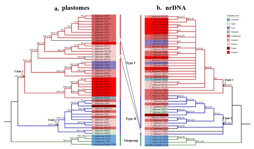 相关研究以Dense infraspecific sampling reveals cryptic differentiation in the enigmatic hemiparasitic love vine Cassytha filiformis (Lauraceae)为题,发表于国际系统进化期刊Journal of Systematics and Evolution (JSE)。版纳植物园已毕业博士研究生刘志芳博士为第一作者(现就职于山东省农业科学院休闲农业研究所),李捷研究员为通讯作者。版纳植物园慈秀芹高级实验师、李朗副研究员和孟宏虎副研究员,以及阿德莱德大学John G. Conran教授、爱丁堡大学Alex D. Twyford教授和爱丁堡皇家植物园Peter M. Hollingsworth教授等为共同作者。