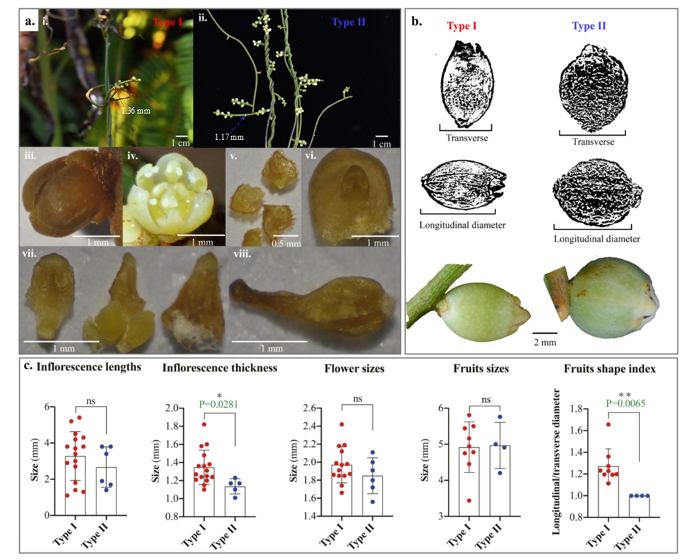 系统发育分析结果显示C. filiformis形成了两个支持率良好的单系分支,形态学分析显示两个分支在花序梗粗细和果型比上存在显著差异,物种分布模拟显示不同的环境因素影响了它们的分布。此外,研究推测两分支的分化时间大约在早中新世,认为无根藤隐存物种的分化可能与早中新世东亚季风带来的新的生态机会和寄主多样化有关。该研究揭示了无根藤在中国及邻近区域的隐存多样性,打破了“中国无根藤单物种”的原有认知,为寄生植物中隐形物种的广泛存在提供了新证据,并揭示了历史气候变化在推动寄生、半寄生物种分化方面的重要作用。