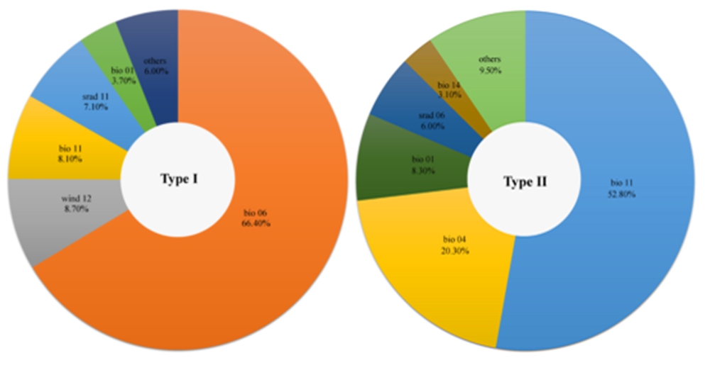 图3. 重要环境变量对无根藤两隐存种当前分布的贡献率
