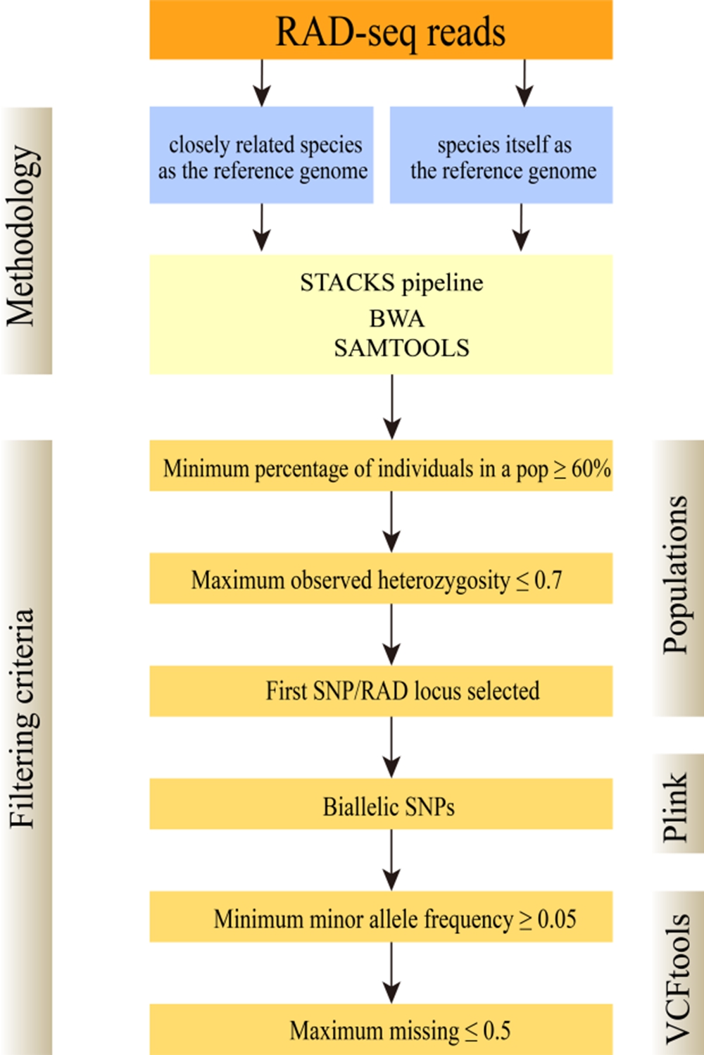 中国科学院西双版纳热带植物园(以下简称“版纳植物园”)植物系统发育与多样性保护研究组选取黄杞(Engelhardia roxburghiana)为研究物种,利用生物信息学软件STACKS,探索使用不同参考基因组对SNP Calling的影响。该研究围绕两种不同参考基因组:使用近缘种(即枫杨:Pterocarya stenoptera)作为参考基因组,以及利用物种本种(即黄杞)作为参考基因组。研究发现在使用物种本种作为参考基因组与使用近缘种作为参考基因组之间获得的SNP数量存在显著差异,即本种作为参考基因组产生的SNP数量明显多于使用近缘种作为参考基因组的情形。这一结果表明,选择物种本种的参考基因组为SNP Calling的最优方案;若物种本种参考基因组不可用,则可考虑使用近缘种的参考基因组,同时建议避免选用亲缘关系较远的物种。此项研究强调了参考基因组选择对SNP Calling的影响,丰富了我们对RAD-seq数据分析的理解。