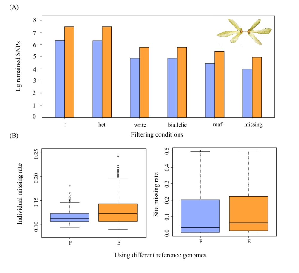 图2 过滤步骤后保留SNP数量的结果,以及保留SNP的位点缺失率和个体缺失率。(A)不同参考基因组通过过滤步骤从初始到最终的SNP数量的lg转换值。 (B)使用不同参考基因组,获取的最终SNP的位点缺失率和个体缺失率(P:枫杨作为参考基因组;E:黄杞作为参考基因组)