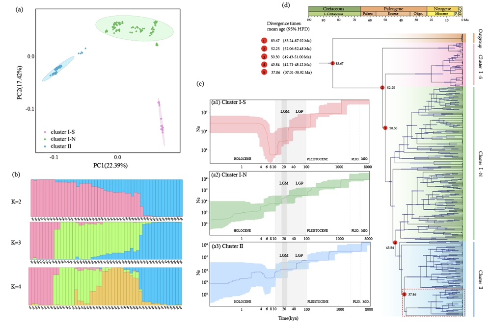 图1 黄杞种群遗传结构、有效种群大小波动和分化时间。 (a) 主成分分析(PCA)用颜色编码表示不同的组;红色、绿色和蓝色分别表示cluster I-S、I-N和II;(b) K = 2、K = 3、K = 4的结构分析直方图。x轴表示种群,y轴量化了推断的祖先血统的比例; (c)通过stairway plot推断三组黄杞的有效种群大小波动的历史。x轴表示千年前之前的时间(kya),y轴表示有效种群大小。粗体颜色曲线和浅色阴影区域分别显示中值估计值和95%置信区间。浅灰色和深灰色阴影区域分别表示末次冰期(LGP)和末次盛冰期(LGM); (d) 由beast推断的分化时间图。蓝条代表95%的最高后验密度(HPD)区间,红色虚线包括海南岛的黄杞