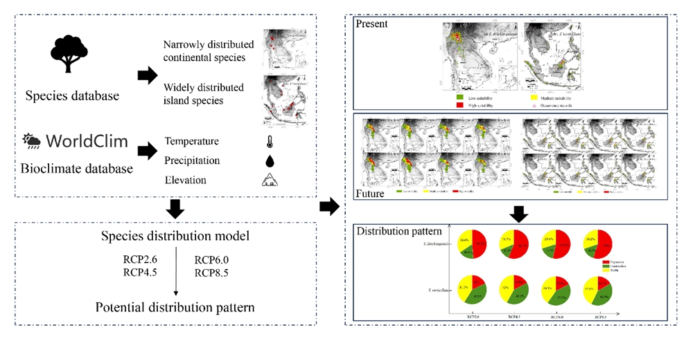 为了深入解析这一问题,中国科学院西双版纳热带植物园(以下简称“版纳植物园”)综合保护中心植物系统发育与多样性保护研究组的研究人员,通过生态位模型模拟了热带亚洲三棱栎属(Trigonobalanus)的两个姊妹物种在当前和未来气候变化不同时期的分布范围,以及不同气候变化情景下的潜在分布变化。两个姊妹物种在热带亚洲的分布范围显示为大陆—岛屿分布。大陆物种—三棱栎(T. doichangensis)仅分布于中国云南和泰国北部清莱,岛屿物种—轮叶三棱栎(T. vericillata)则广布于东南亚各岛屿区域。模拟结果显示,温度是影响大陆物种三棱栎分布的关键因素,而降水则是影响岛屿物种轮叶三棱栎分布的主要因素;未来,狭域分布的大陆物种三棱栎的潜在分布范围可能会扩大,而广域分布的岛屿物种轮叶三棱栎的潜在分布范围可能会缩小;同时,在气候变化的影响下,低纬度热带地区的山顶有望成为大陆和岛屿物种的避难所。这一研究认为,广域分布的岛屿物种轮叶三棱栎将更容易受到未来气候变化的影响,而狭域分布的大陆物种三棱栎受到的影响则较小。据此,建议在受气候变化影响最严重的适宜区建立保护区,以保持物种栖息地的稳定,并开展对两物种受威胁状况的全面评估。