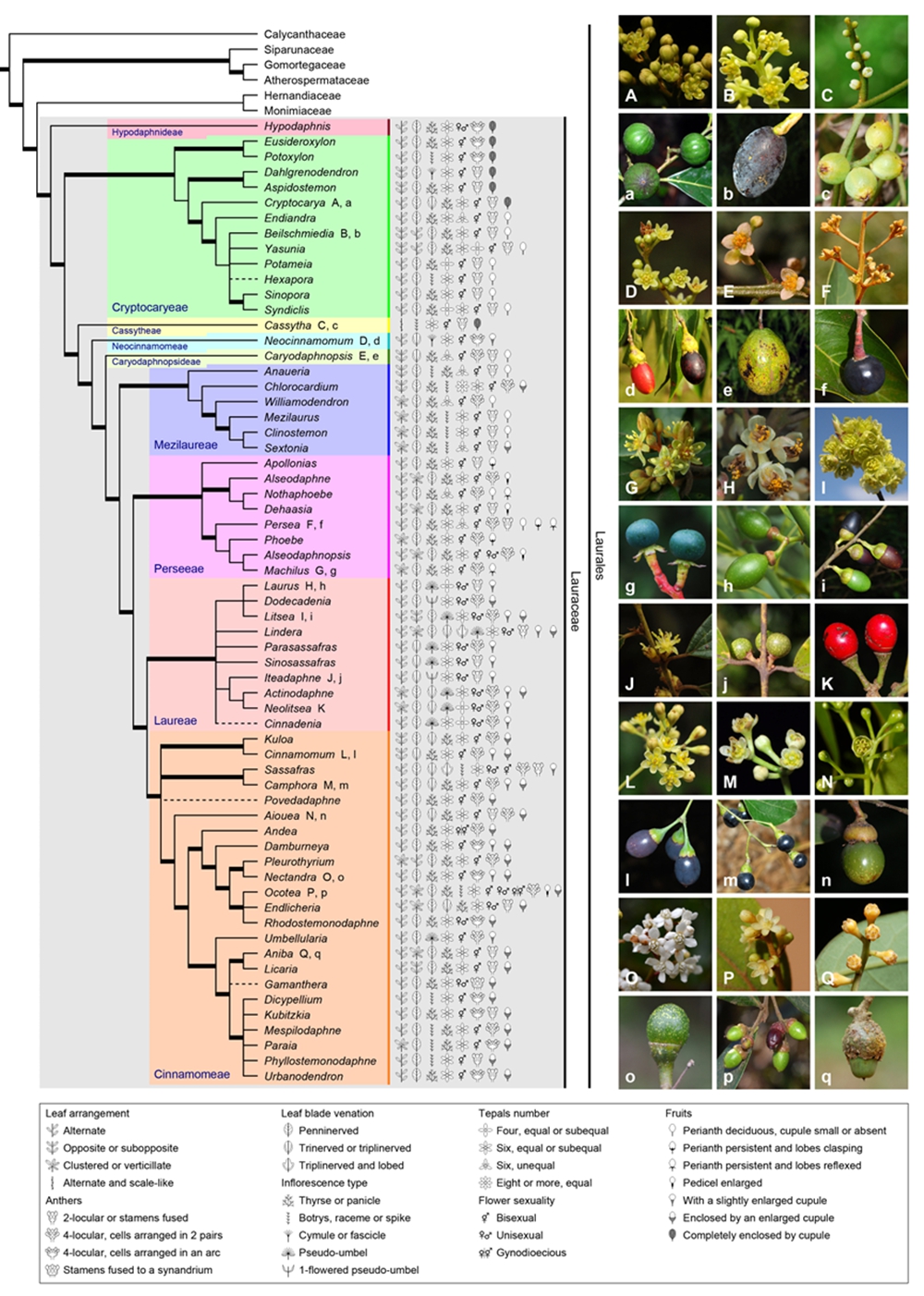 近期,中国科学院西双版纳热带植物园(以下简称“版纳植物园”)通过国际合作,联合全球多位樟科研究学者,系统梳理并综述了2000年以来樟科植物在系统发育、分类学与生物地理学等领域所取得的研究进展。分子系统学研究明确了樟科植物的基本系统发育框架,其中基于叶绿体基因组的系统发育为厘清科内各类群间的亲缘关系提供了有力证据,综述中最终确立了全新的樟科九族分类系统:包括棠桂族(Hypodaphnideae)、厚壳桂族(Cryptocaryeae)、无根藤族(Cassytheae)、新樟族(Neocinnamomeae)、檬果樟族(Caryodaphnopsideae)、桂土楠族(Mezilaureae)、鳄梨族(Perseeae)、月桂族(Laureae)和樟族(Cinnamomeae)。在分类学方面,研究工作主要聚焦于樟科植物的多样性中心(热带亚洲、热带美洲和非洲的马达加斯加)。自最近一次科级系统修订以来,已新增发表了6个新属并重新恢复了5个属的分类地位。樟科植物丰富的化石记录显示,其在白垩纪晚期(Late Cretaceous)至新生代早期(Early Cenozoic)发生了全球范围内的多样化。历史生物地理学研究表明,樟科内的不同谱系可划分为冈瓦纳古陆类群和劳亚古陆类群,其分布格局分别是北热带植物群(Boreotropical Flora)解体与迁移和多次长距离扩散事件作用的结果。针对东亚地区樟科植物的谱系地理学研究揭示了冰期避难所的存在,以及多个樟科物种在第四纪原地存活、保持种群稳定或扩张的演化历史。此外,近年来基于全基因组数据的比较基因组学研究,进一步揭示了樟科植物的基因组演化历史及其代谢多样性特征的遗传基础。然而,目前樟科内多个类群间的系统发育关系仍有待解析,其复杂的生物地理历史与生态功能亟需深入研究。最后,建议在未来采用多学科交叉的研究策略,整合野外调查、基因组学、形态学和生态学等多种研究手段,以全面揭示这一兼具重要生态与经济价值植物类群的演化历史及多样性形成机制。