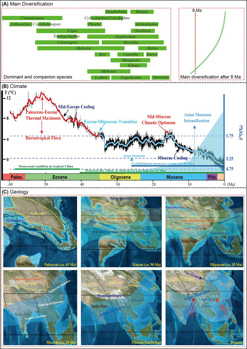 近日,中国科学院西双版纳热带植物园(以下简称“版纳植物园”)植物系统发育与多样性保护研究组联合国内多家科研机构通过整合多学科证据,系统整理了东亚亚热带常绿阔叶林的起源演化和未来发展趋势,重点阐释了以下关键科学问题。