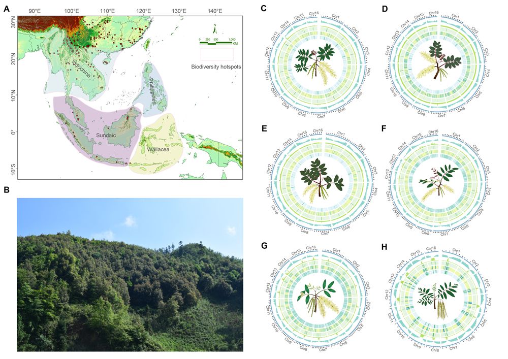 近日,为深入揭示EASM驱动下EBLFs植物的基因组适应机制,中国科学院西双版纳热带植物园(以下简称“版纳植物园”)植物系统发育与多样性保护研究团队选取生态类型多样、地理分布广泛的黄杞属(Engelhardia)作为研究模型—该属广泛分布于东南亚至中国南部,跨越从热带雨林到亚热带常绿阔叶林的多个生态带,既包含少叶黄杞(E. fenzelii)、黄杞(E. roxburghiana)等典型常绿树种,也涵盖 云南黄杞(E. spicata) 复合群等分布于热带干旱环境的落叶类群,充分反映了对不同水热环境的长期适应与演化分化(图1A和B),为理解季风气候背景下植物生态分化、功能适应和基因组演化提供了天然模型,也为揭示常绿阔叶林起源与演化机制提供了关键线索。