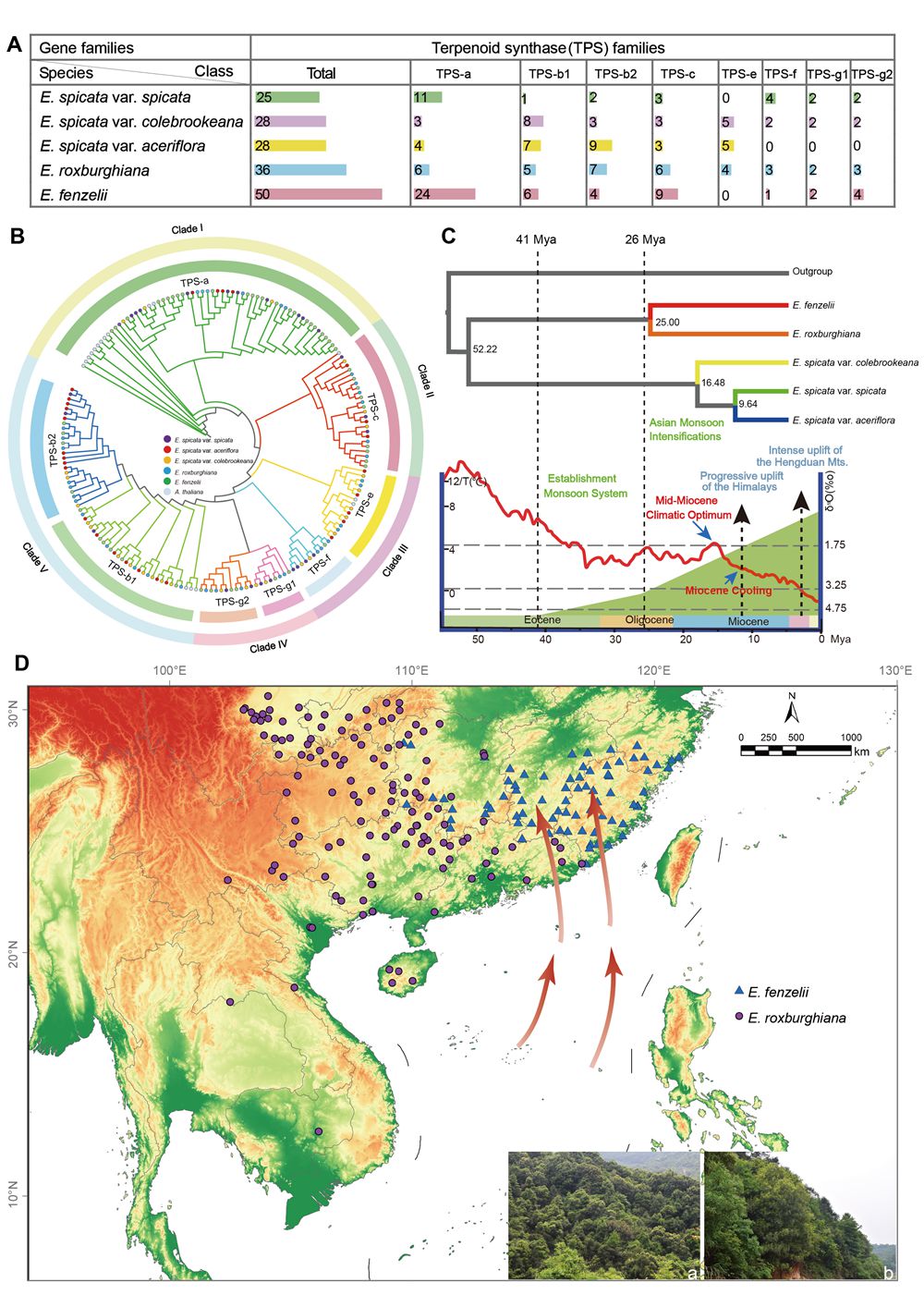 图2. 黄杞属 TPS 基因家族鉴定及气候变化对少叶黄杞(E. fenzelii)萜类合成的潜在影响。(A)五个黄杞属物种中与萜烯合酶相关的主要基因家族拷贝数;(B)基于五个黄杞属及拟南芥蛋白序列构建的最大似然系统发育树;(C)五个黄杞属及外类群(马尾树)的系统发育树及分化时间估算,并结合全球温度变化序列;(D)E. roxburghiana 与 E. fenzelii 的分布及生境。 (a) 为 E. roxburghiana 生境,(b) 为 E. fenzelii 生境。