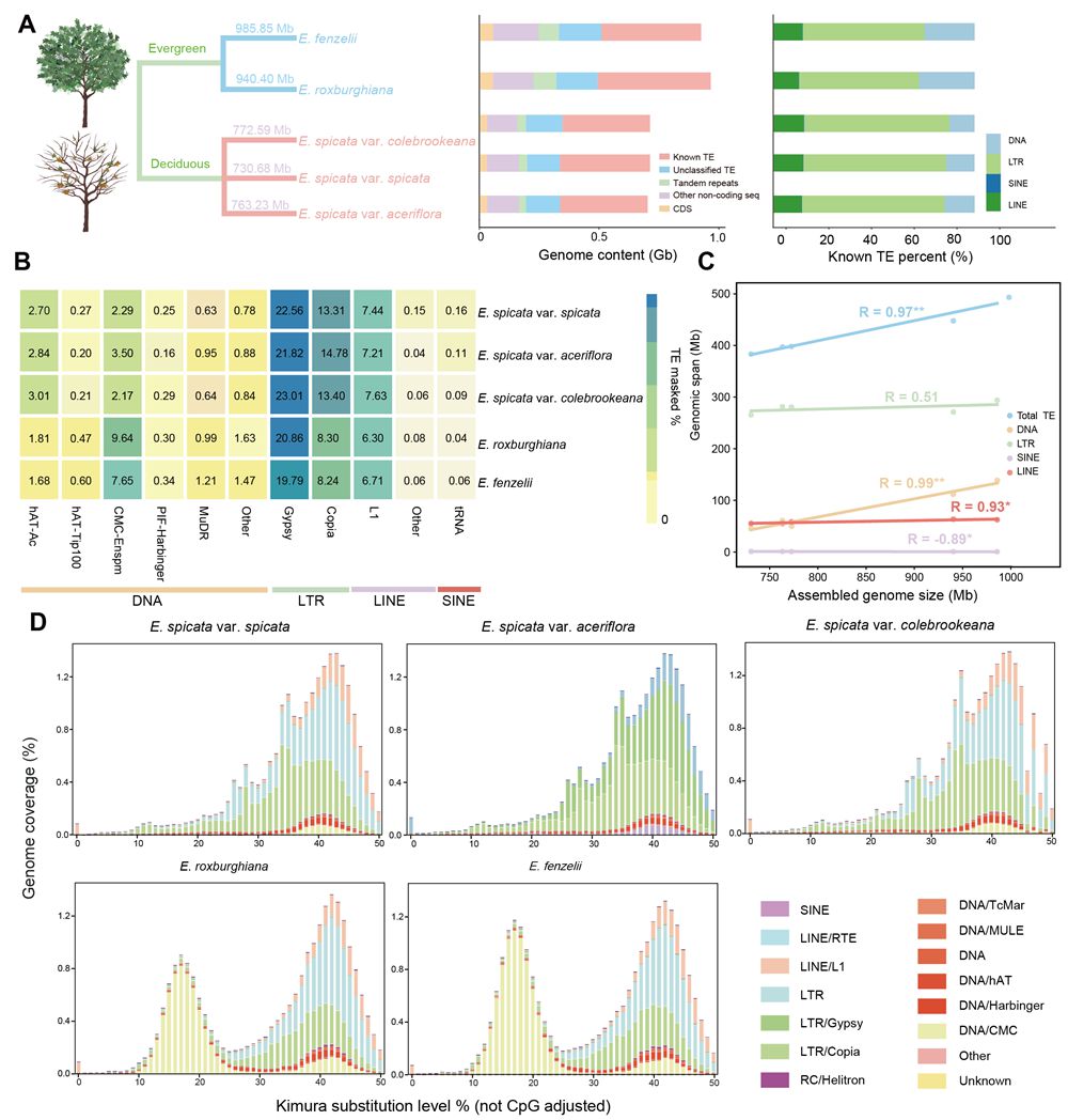 基因家族富集分析进一步揭示了常绿与落叶类群在功能上的显著分化。常绿类群扩张的基因主要富集于光合作用、激素信号转导及氧化还原过程等路径,反映其对湿润、低光、高竞争环境的长期适应;而落叶类群中扩张的基因则显著富集于ABA信号通路、次生代谢和防御反应相关路径,强化了其对干旱胁迫的快速响应机制。该结果表明常绿与落叶生态策略的形成不仅体现在谱系分化与基因组结构上,也深刻嵌入于基因功能的选择性扩增之中。进一步分析发现,常绿物种E. fenzelii在基因组功能上展现出显著的适应性优势。其中,与植物挥发性代谢与防御反应相关的TPS(萜烯合酶)基因家族出现了大规模扩张,可能赋予其在湿润、竞争激烈的常绿林中更强的生存能力(图2A和B)。同时,E. fenzelii的基因组显著大于落叶类群,主要归因于转座子(TEs)—特别是DNA_CMC-EnSpm家族的持续扩增(图3)。基因组组成变化叠加功能扩张,E. fenzelii显现出基因组层面的“适湿型”进化路径,为应对夏季风带来的高温高湿环境提供了遗传支撑。