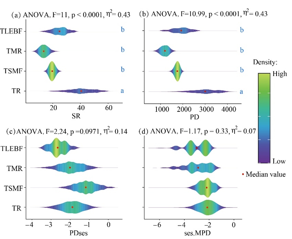 图1 不同生物多样性指标在四个森林类型之间的差异比较,不同的字母表示样地之间存在显著的差异。