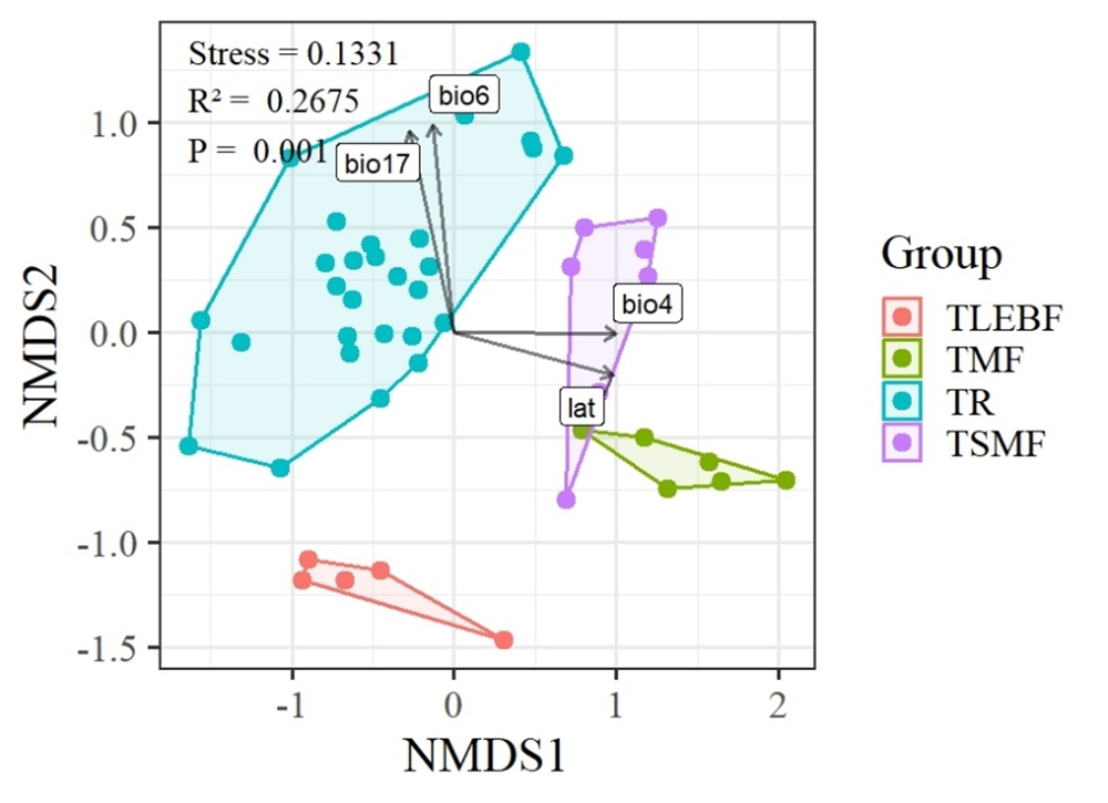 图2 森林类型NMDS相似性排序分析图,箭头表示与排序有显著相关的变量