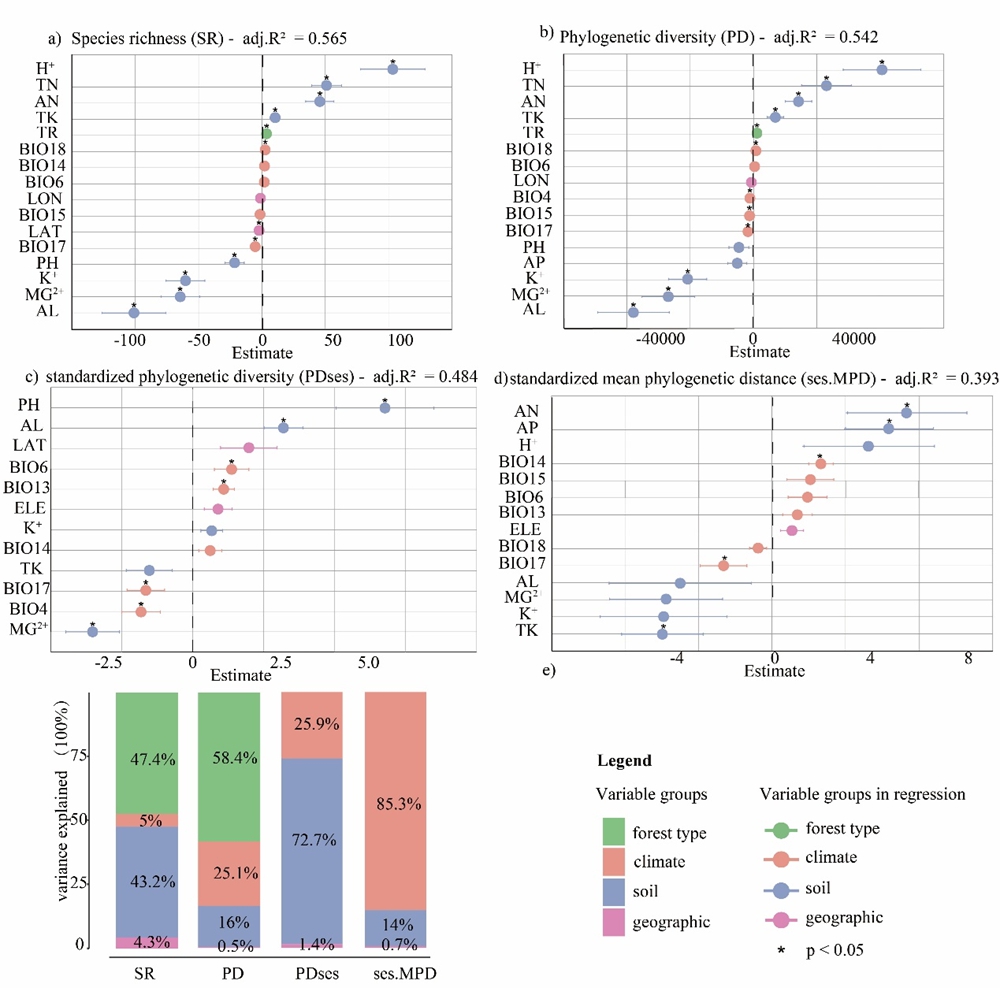 图3 生物多样性指标与环境之间的逐步多元回归系数图与贡献率