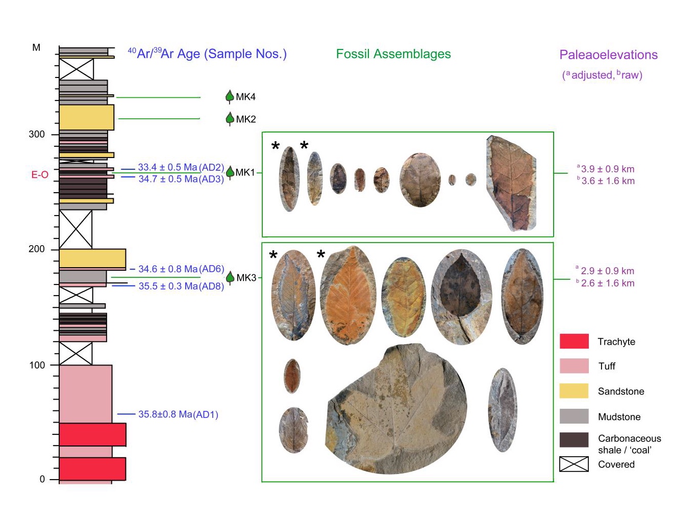 经过多年的野外工作,在西藏芒康县新生代地层中发现了保存完好的植物化石和火山凝灰岩(图一)。植物化石分别产于4个层位,其中MK3和MK1层化石保存最佳,种类和数量都较多,能够进行古气候和古高程重建的研究。另外,在这两层化石的邻近层位还发现了火山凝灰岩,为确定绝对地质年代奠定了基础。利用氩-氩法对地层中的火山凝灰岩进行了测年,结果表明位于下部的MK3层所代表的地质年代为34.6 ± 0.8 Ma,而位于上部的MK1层所代表的年代为33.4 ± 0.5 Ma。这段时期地球历史经历了始新世到渐新世的转折期(Eocene-Oligocene Transition,时间界限为33.9 Ma)。整体上看,这套地层中的化石植物类群和青藏高原东南缘现代不同海拔的植物类群具有很高的相似度。其中,MK3层所出产的化石主要类群为壳斗科的常绿类群青冈亚属植物(Quercus subg. Cyclobalanopsis)和落叶类群桦木科(Betulaceae),代表了常绿和落叶混交的森林;而MK1层的类群包括小叶的柳属(Salix)、蔷薇属(Rosa)、高山栎组(Quercus sect. Heterobalanus)等,代表了高山矮灌丛类型。通过气候-叶相多变量分析程序显示,古温度经历了一定的降低过程。利用湿静态能原理重建了MK3和MK1层所代表的古高程,其中MK3层的古高程为2910 ±910米,而MK1层的古高程为3850 ±910米,表明该地区的古高程在始新世到渐新世的转折期上升了约900米,并接近或达到现代的海拔高度3900米(图二)。