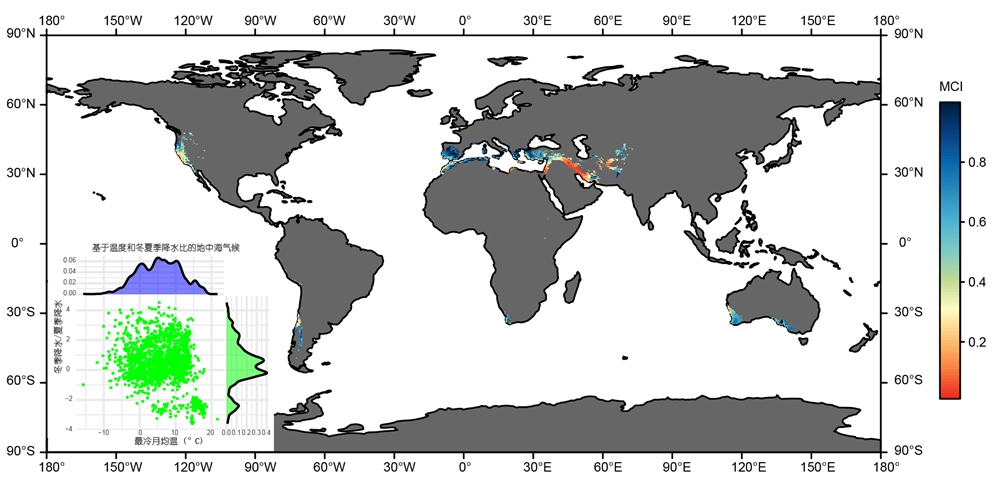 图2. 基于最冷月均温和降水的季节性差异计算的期望值和地中海气候指数,以及地中海气候分布区