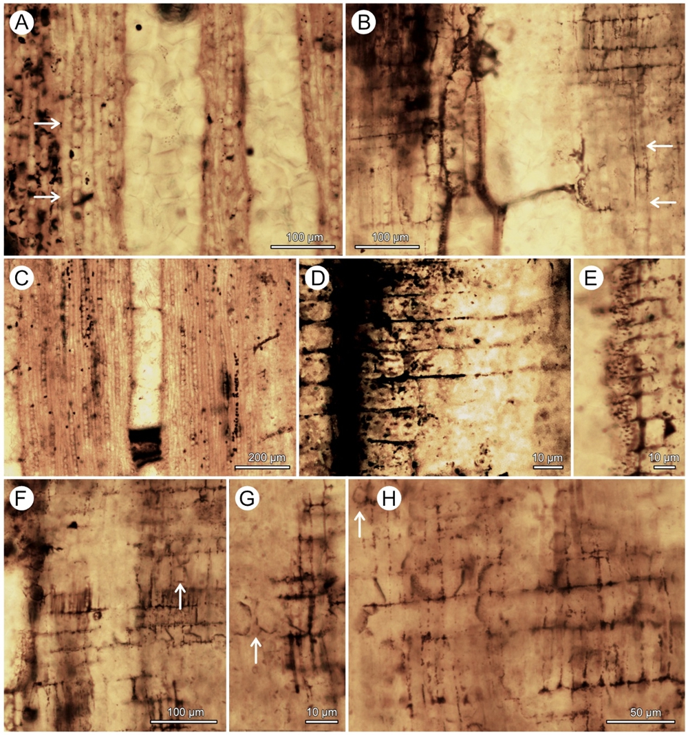 图 2. 榄仁型木 Terminalioxylon sp. (cf. T. eo-olivari) 的木材解剖结构,示弦切面(A、C)和径切面(B、D、E、F、H)。
