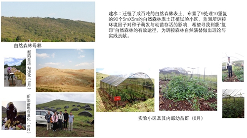 由沈有信研究员承担的国家重点研发计划项目《喀斯特断陷盆地石漠化演变及综合治理技术与示范》的子专题均在2017年顺利启动。课题组在建水县林业局协助下,完成了9处理10重复的90个5mX5m的自然森林表土迁植试验小区布设,经过精心管护,已经成功萌发出被迁植森林内的几乎全部森林物种,不同演替阶段的乔、灌、藤及林下草本物种种类齐全,数量庞大,为成功的自然森林构建打下了幼苗基础。下一步将继续观测幼苗的竞争、成活,寻找优化调控途径。热诚欢迎其它研究组以此为平台开展研究。
