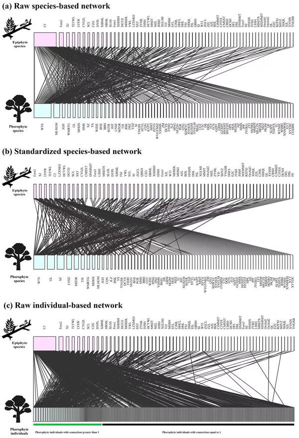 群落中聚集在一起的物种往往有着直接或间接的相互关联,这些关联形成的互惠、拮抗等种间关系对物种多样性和群落稳定性的维持至关重要。在热带和亚热带森林冠层,一种特殊的植物类群因依附于其它植物上生长被称为“附生植物”,而它们与附着的宿主之间形成的种间关系被称为“附生关系”。一方面,这种附生关系通过种间的相互作用维持着附生群落的稳定;另一方面,一旦宿主受到破坏,将对附生植物群落产生直接影响。因此,探究附生关系网络的结构特征,分析附生关系网络在维持附生群落稳定中的作用,是附生植物共存机制研究中的关键问题,也是保护与恢复附生植物多样性的关键。