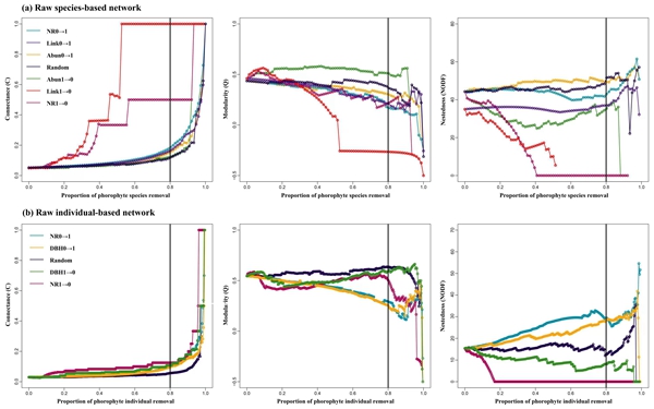在此基础上,研究人员以西双版纳热带季节雨林中的附生维管植物为对象,将附生关系的研究从物种尺度扩展到了个体尺度,并采用模型模拟的方法,探讨了不同乔木宿主移除情景下附生关系网络结构的稳定性。结果表明:附生维管植物-宿主网络呈现低连通度和中等模块性的结构特征。物种水平附生网络在标准化后嵌套性减弱,但仍显著高于个体水平附生网络的嵌套性。优先移除网络中强相互作用的宿主将严重影响附生植物群落结构的维持,当宿主移除比例接近80%时网络结构特性发生急剧变化。由此可见,附生植物-宿主网络在低强度干扰下尚能保持群落的稳定,但当干扰强度达到一定阈值时附生植物群落或将崩溃。相关研究结果以Simulated high-intensity phorophyte removal mitigates the robustness of epiphyte community and destroys commensal network structure为题,发表于林学专业学术期刊Forest Ecology and Management上。