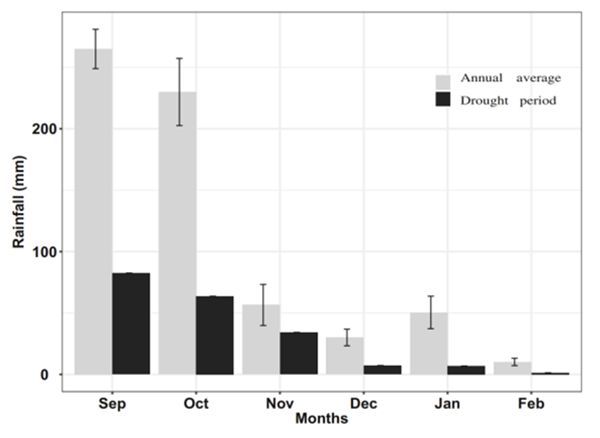 图1. 2009年9月至2010年2月干旱期与同期的月降雨量比较
