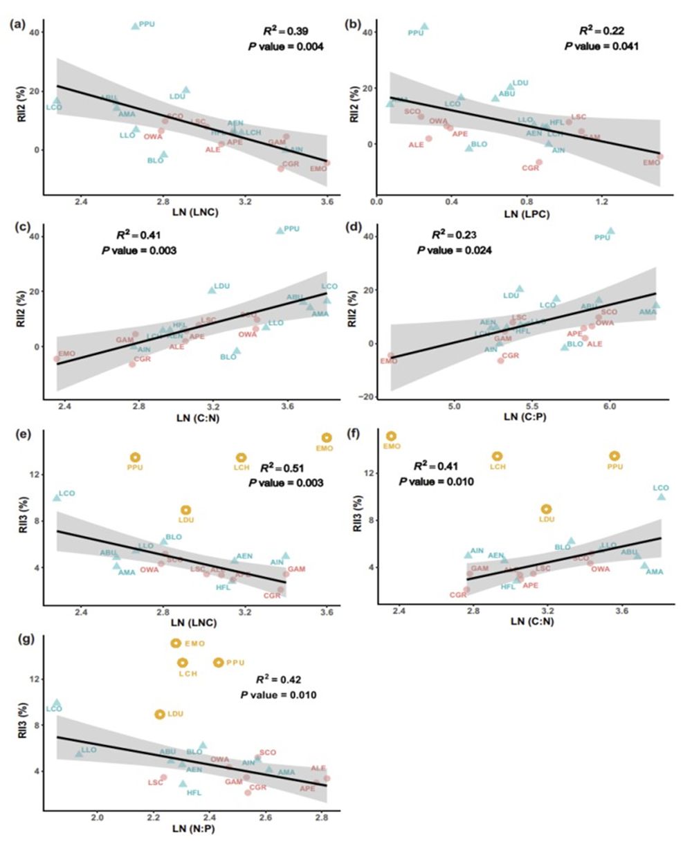 图2. 附生维管植物化学计量性状与种群动态的关系