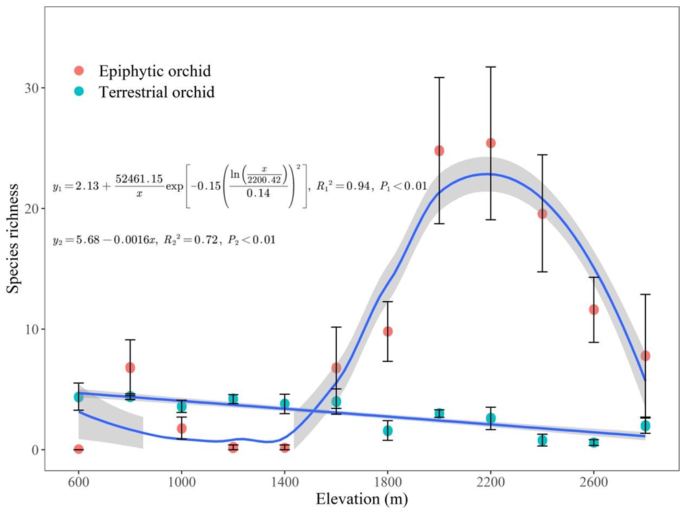 物种丰富度与海拔高度之间的关系一直是生物多样性研究的核心主题。兰科植物是单子叶植物的第一大科,广泛分布于除两极和干旱沙漠以外的几乎所有陆地生态系统,它们在保护和进化研究等方面具有重要价值,然而,目前关于兰科植物多样性沿海拔梯度分布格局的研究还很少。此外,全世界约有70%的兰科植物营附生生活,遗憾的是,人们仍不清楚附生兰科植物与宿主树之间到底存在怎样的相互关联。