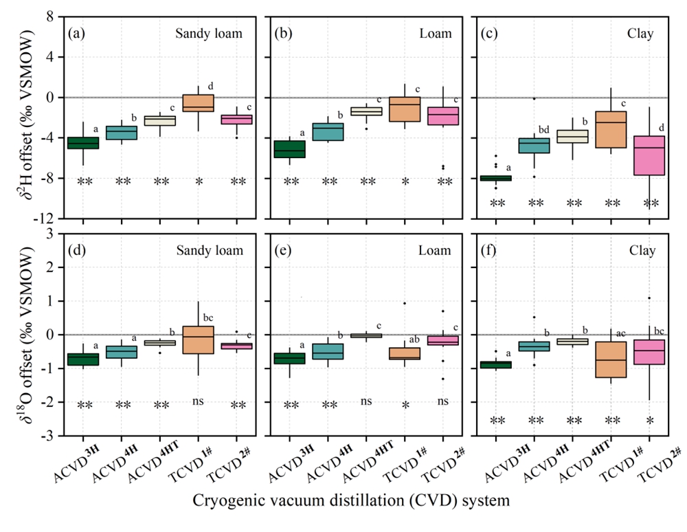 图2. 低温真空抽提(CVD)土壤水的δ2H(a-c)δ18O(d-f)偏差