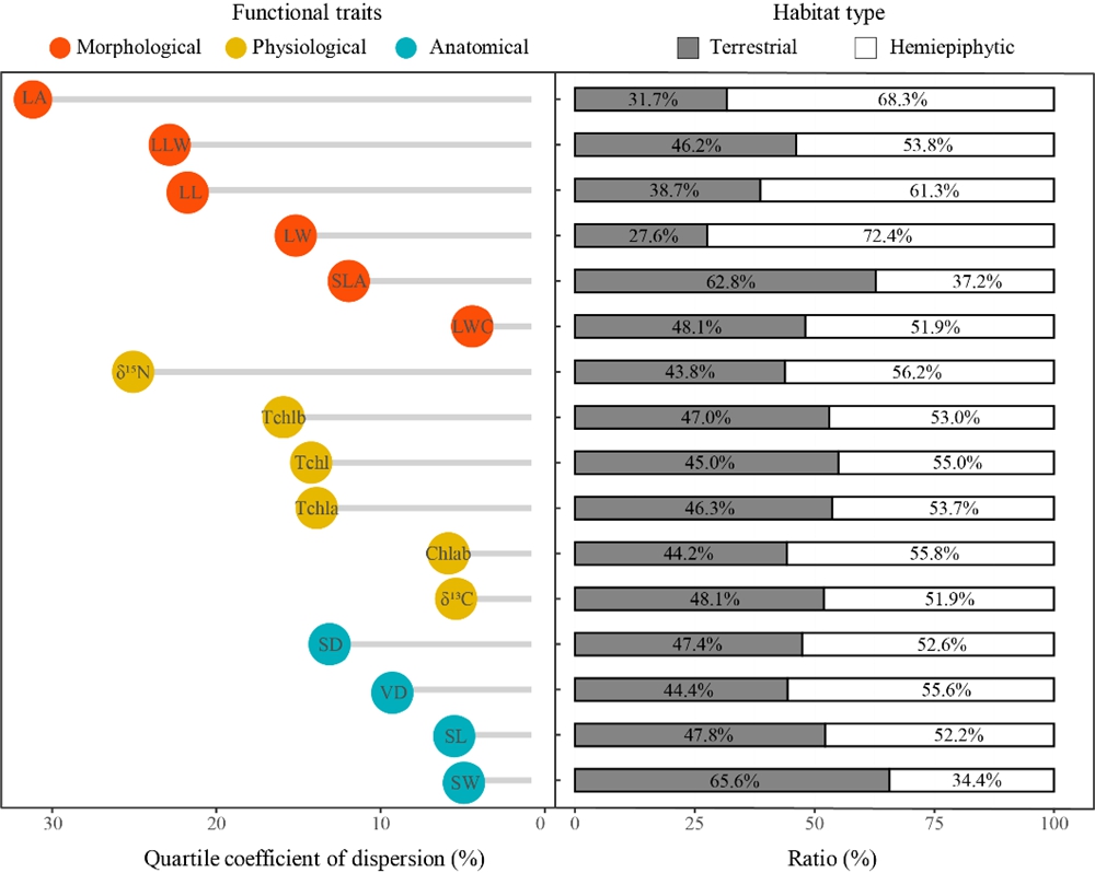 为此,中国科学院西双版纳热带植物园(以下简称“版纳植物园”)恢复生态学研究组联合云南大学、缅因大学相关科研人员,以热带常见绞杀植物斜叶榕(Ficus tinctoria)为研究对象,测定了不同生境类型(半附生和地生)、不同生长阶段(大树、中树和小树)和不同冠层位置(上层、中层和下层)叶片的功能性状,结果表明:斜叶榕的叶功能性状存在显著的种内变异,且半附生斜叶榕经历了更加复杂多变的垂直生境,相比地生斜叶榕其具有更强的冠层适应特征。此外,不论是半附生斜叶榕还是地生斜叶榕,均能通过性状组的协同变化来适应不同生长阶段的环境。该研究发现多尺度的植物功能性状的种内变异和协同变化可帮助植物适应复杂多变的生境,并强调了种内变异在探究基于性状的植物适应策略中的重要性。