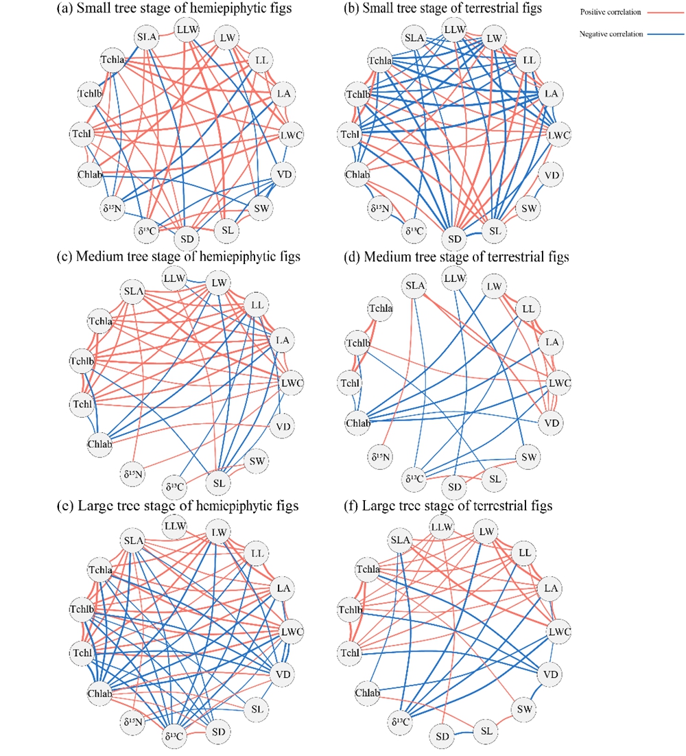 图3 . 不同生境斜叶榕在不同生长阶段叶片功能性状的共变异。圆圈代表各个叶片功能性状,并通过相关性线条连接,线条粗细反映相关性大小