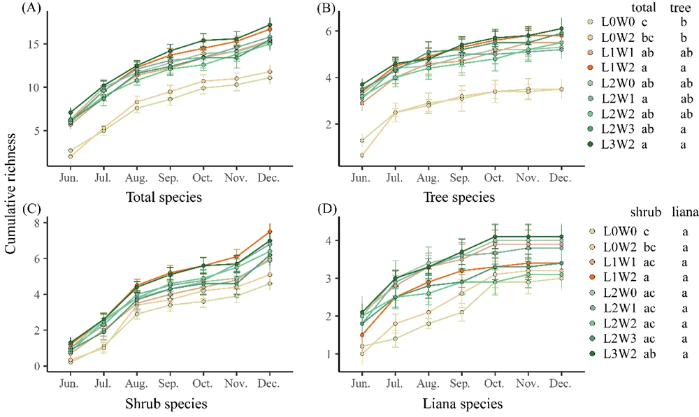 图2:不同减光补水下幼苗累计丰富度的时间动态。(A)总物种,(B)乔木,(C)灌木,(D)藤本。L0W0表示仅表土迁移。对12月进行单因素方差分析,不同字母表示不同减光补水处理间的差异显著。