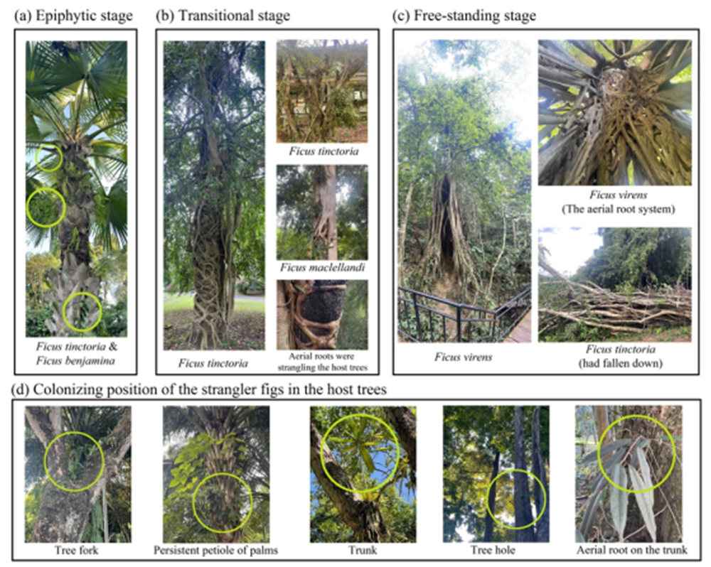 图1. 绞杀榕的不同生长阶段及常见定殖位置