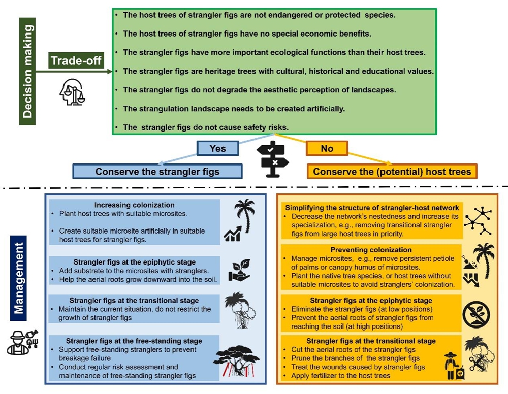 图3. 对热带城市绿地中绞杀榕及其宿主树的管理建议。