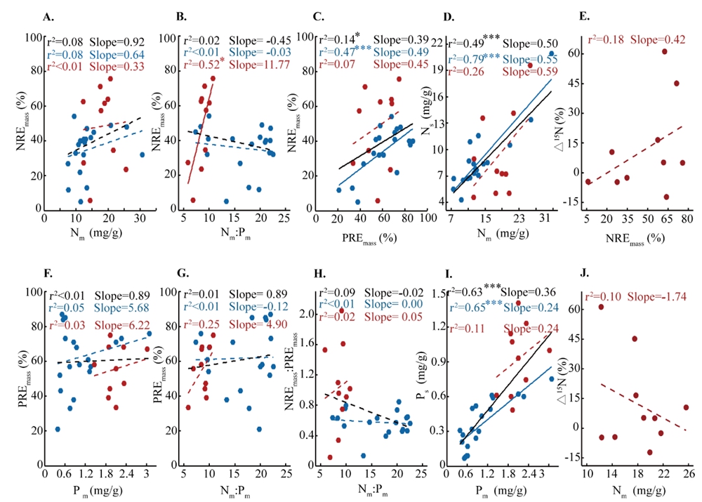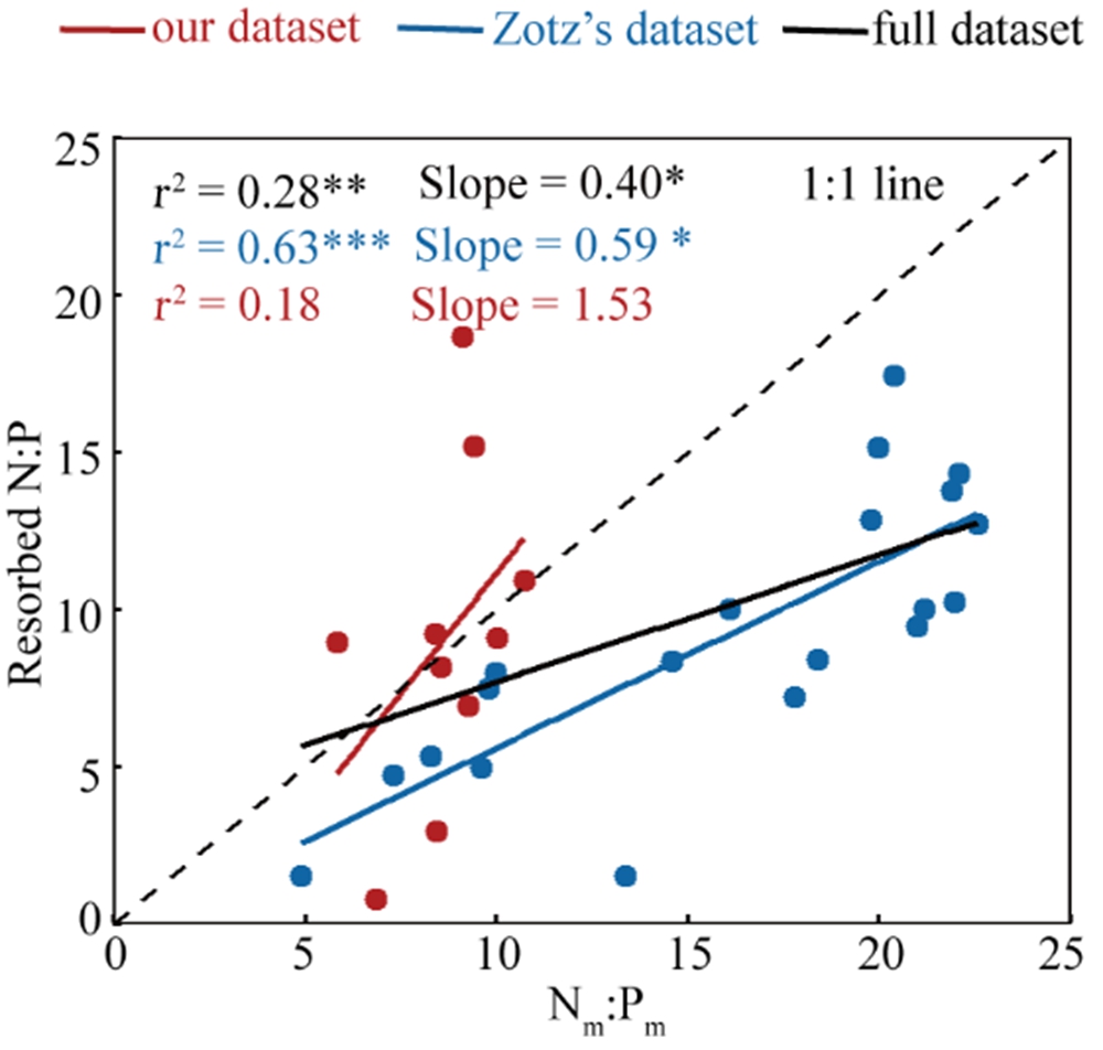 图3 叶片养分的绝对重吸收比率(resorbed N:P)与成熟叶N:P比值(Nm:Pm)的线性回归